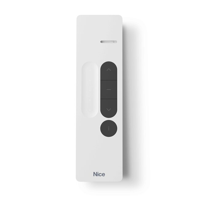 Der Nice DOMIP1SV Handsender in weißer oder schwarzer Ausführung verfügt über 1 Kanal mit einem Schieberegler, Tasten zum Ein- und Ausschalten der Solaranlage und eine Infotaste zur Überprüfung des Automatisierungsstatus. Er kann für die Steuerung einer Anlage oder einer Gruppe von automatisierten Anlagen verwendet werden.