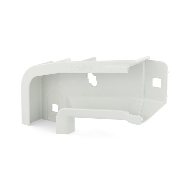 Hörmann stalen hoek koppeling (bocht) van de verticale rails naar horizontale rails, rechts (vanaf 06-1999). Deze stalen bocht betreft een alternatief voor de standaard kunststof uitvoering die in de deur is ingebouwd en waarin de bovenste looprol wordt geleid. Deze metalen uitvoering versterkt het deurblad volgens weerstandsklasse RC2 en biedt zo een betere bescherming tegen inbraak. Het wordt gebruikt vanaf de binnenkant van de garage voor de rechterkant bij de poort. De geleidestrik wordt gebruikt met de beslag L of Z.