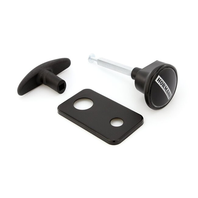 Die Türdrückergarnitur ist aus schwarzem Kunststoff gefertigt und besteht aus einer Abdeckplatte und einem Griff für innen und außen. Dieses Ersatzteil ist für alle Hörmann Sektionaltore ab Baujahr 1. Juni 1999 geeignet. Die Verwendung ist somit auf die Serie 40 beschränkt.