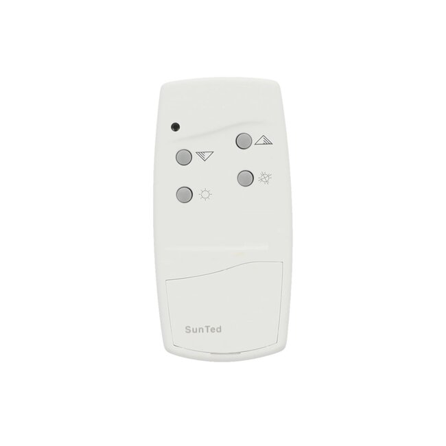 The Tedsen SKX4-SW 4-channel 433 MHz midi handheld transmitter. Two channels allow you to operate the blinds, the remaining 2 channels allow you to switch off the sun function of the light sensor. The 433 MHz frequency can be recognised by the striking orange/yellow LED